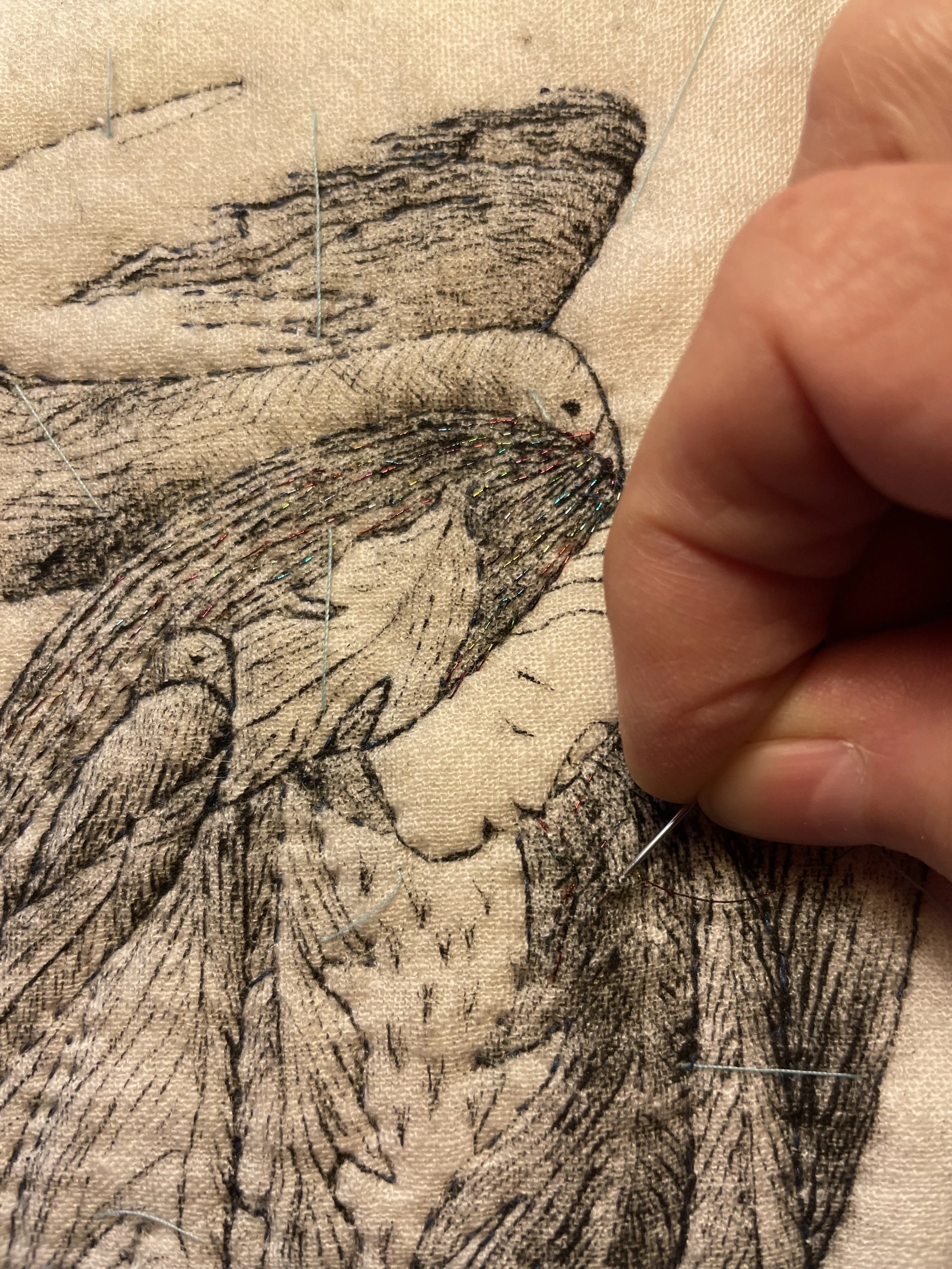 The love of sewing and needlework began to merge with printmaking while attending college and has continued ever since. While exploring various printmaking techniques, Rosemary currently uses an intaglio technique developed by artist, Imero Gobbato, which consists of a masonite ‘plate’ treated and scribed into with a hand-made tool. The detail in imagery can be as sharp and clean as that achieved using the classic metal plate of an etching, but without the toxicity of acid needed to ‘etch’ the lines. The fiber work has evolved since Rosemary’s mother, a talented seamstress, first taught her to thread a needle, and continues a lifelong learning and involvement in the needle arts.